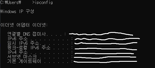 열린 창에서 ipconfig를 입력하면 아래와 같이 나옵니다