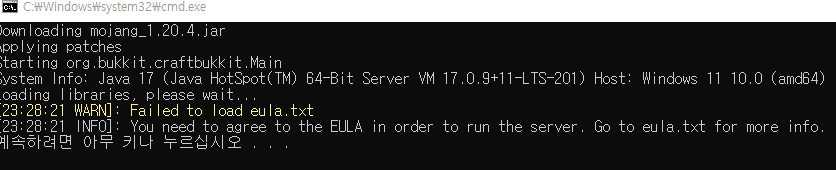 이렇게 뜨면 서버 파일에 eula.txt를 수정해 주시면 됩니다