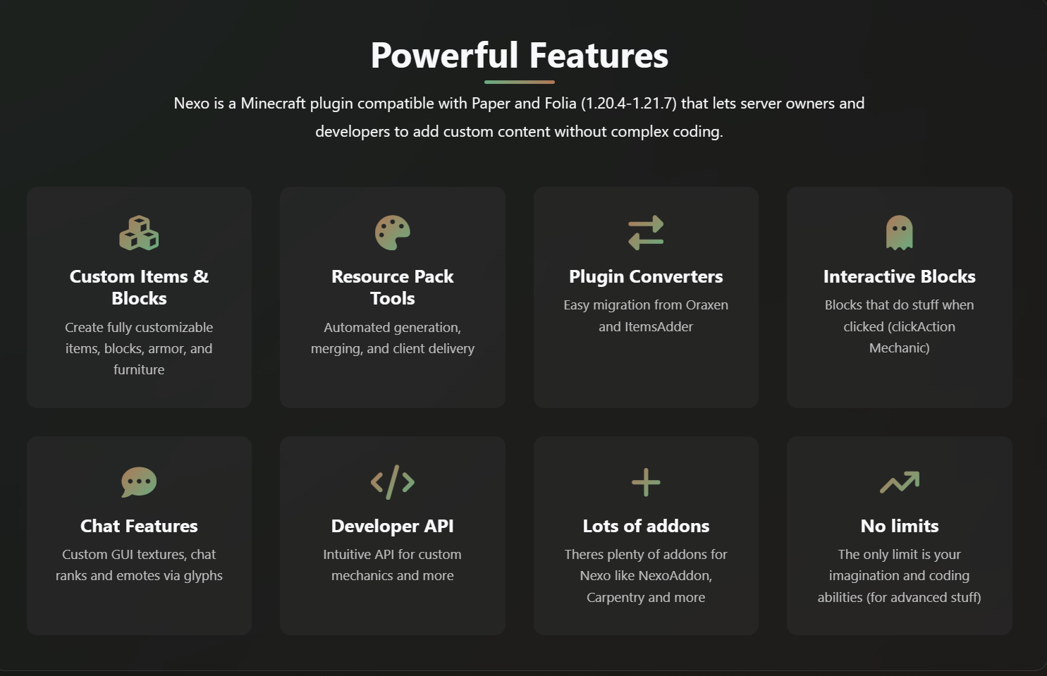 이렇게만 본다면, Itemsadder와 별 차이가 없다고 생각하시는 분들이 많으실것 같습니다. 이제 장단점에서 NEXO를 사용할 만한 이유를 보여드리도록 하겠습니다.