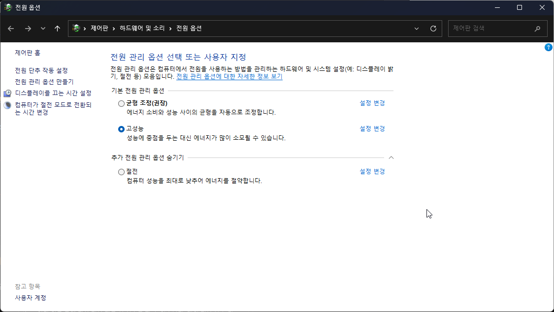 - 전원 관리 옵션: '균형 조정'이 아닌 '고성능'으로 바꿔야 CPU가 일을 한다.