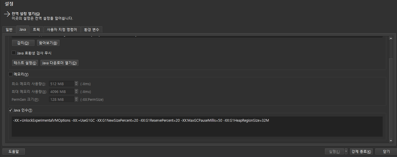 - 프리즘 런처 실행 -> 변경할 인스턴트 선택 -> 편집 -> 설정 -> Java 인수 체크