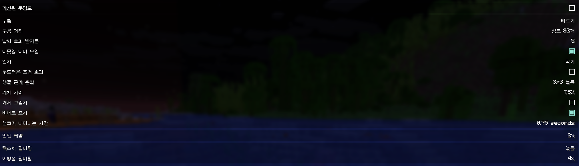 위 와같이 해도 충분한 최적화를 느낄 수 있을것이다. 다만, 이 설정에도 렉이 걸릴분들을 위해서 적당한 최적화 세팅을 아래와 같이 추천해준다. 아래 설정은 모두 소듐 설정이다.