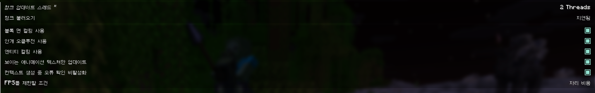 권장 설정을 하고 뭘 해도 최적의 옵션으로 미리 설정되어 있는 최적화 모드팩을 설치하는것이 최고의 방법이다.
