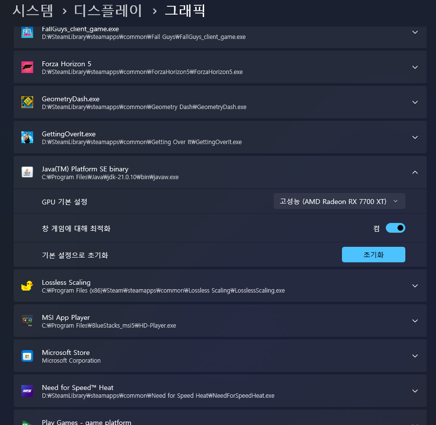 - 그래픽 설정 : 윈도우 설정 -> 시스템 -> 디스플레이 -> 그래픽 설정에서 javaw.exe를 찾아 '고성능'으로 지정하자. 내장 그래픽대신 외장 그래픽을 강제로 쓰게 하는 방법이다.